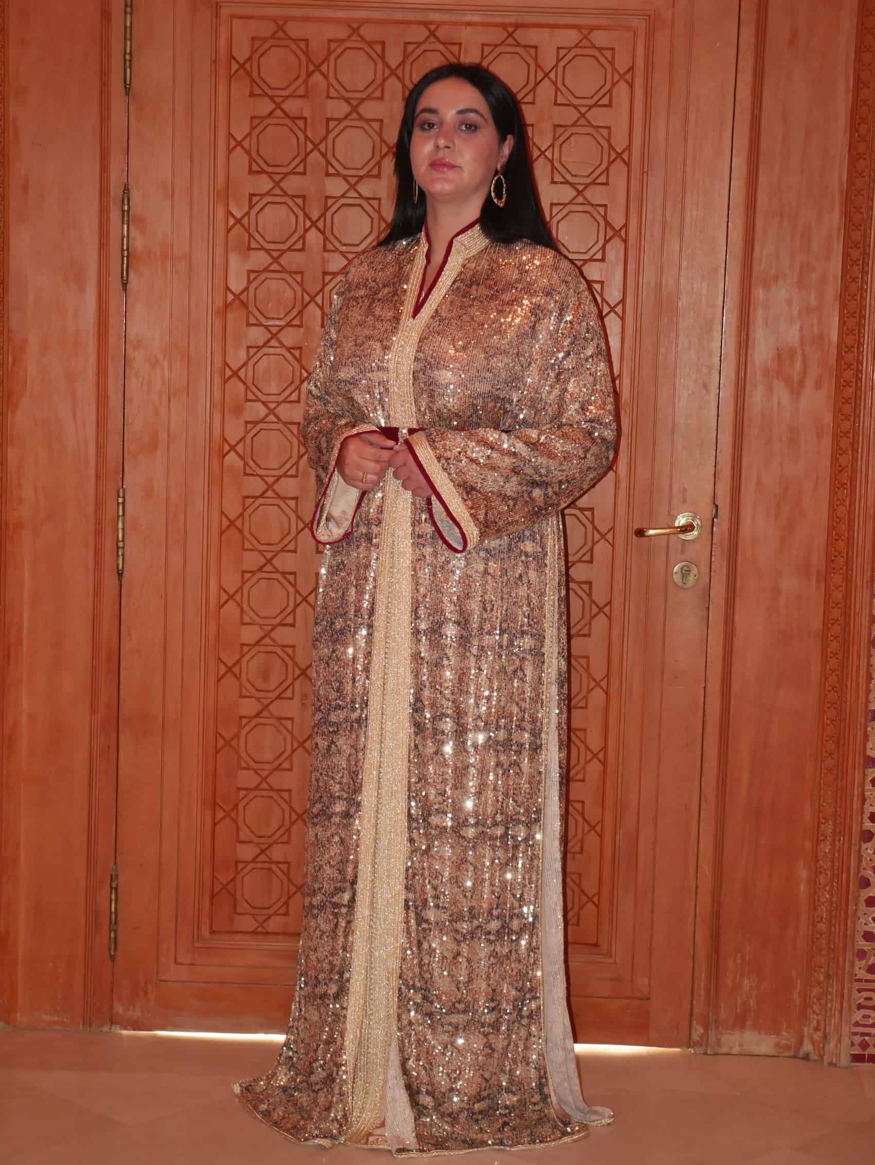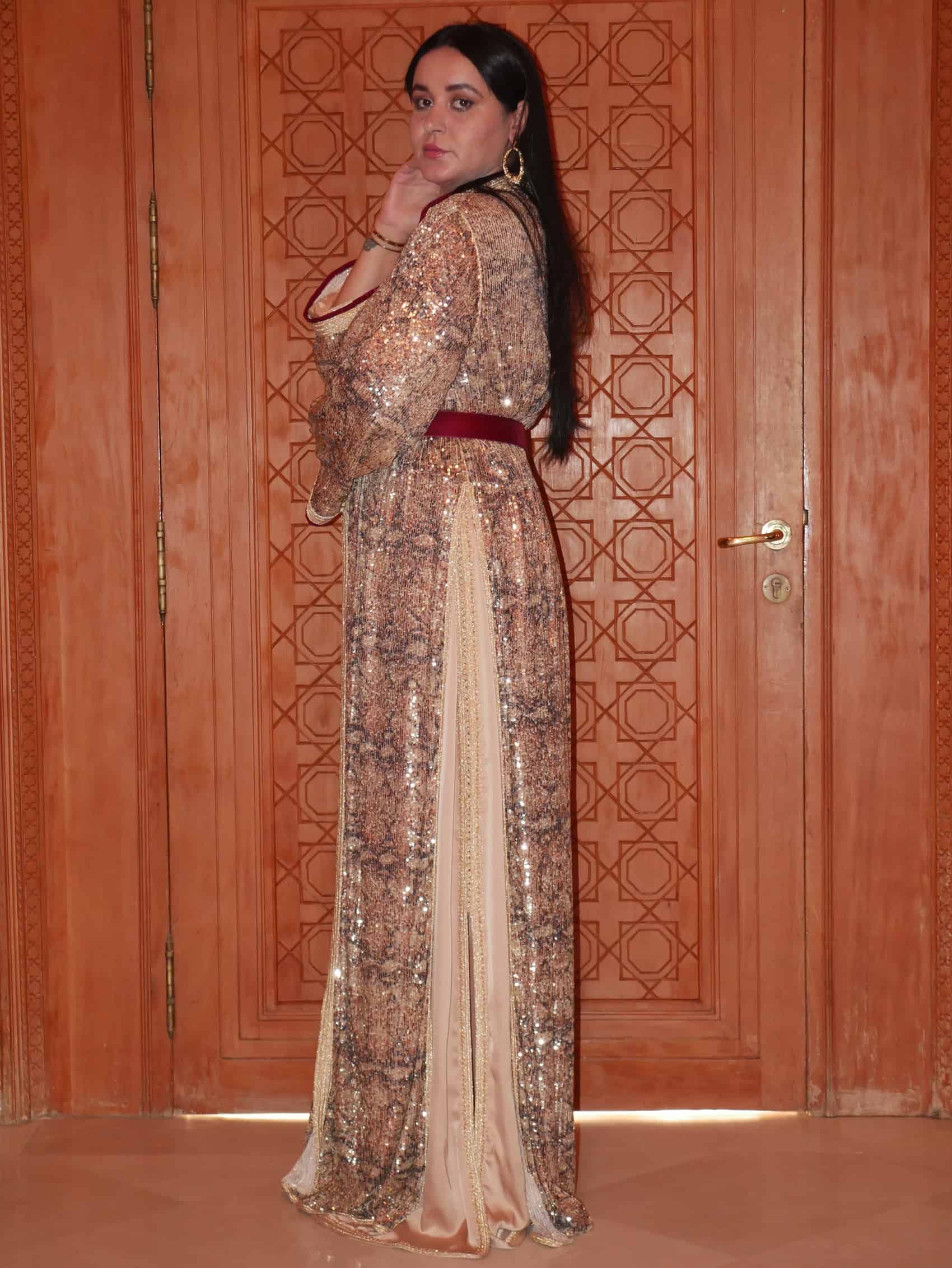 La tenue Zahra El Malika est une ode à la royauté féminine et au raffinement absolu. Réalisée dans une palette lumineuse de doré et de champagne, elle se distingue par un travail de broderie et de texture riche, captant la lumière à chaque mouvement.