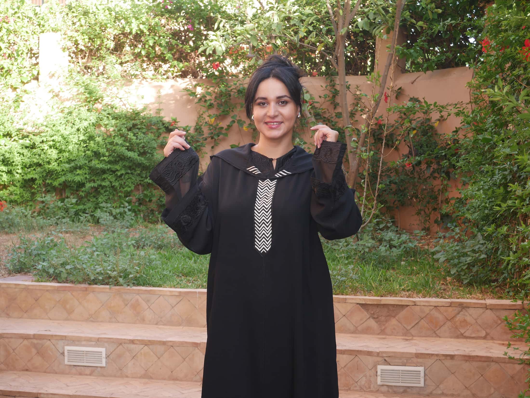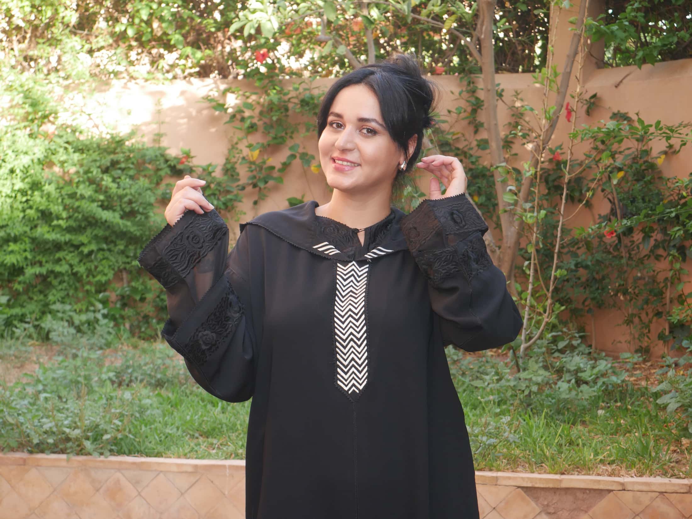 La tenue Nahla incarne la force de la simplicité maîtrisée. Confectionnée dans un noir profond et fluide, elle se distingue par des détails brodés délicats au niveau de l’encolure et des manches, apportant relief et caractère sans jamais alourdir la silhouette.