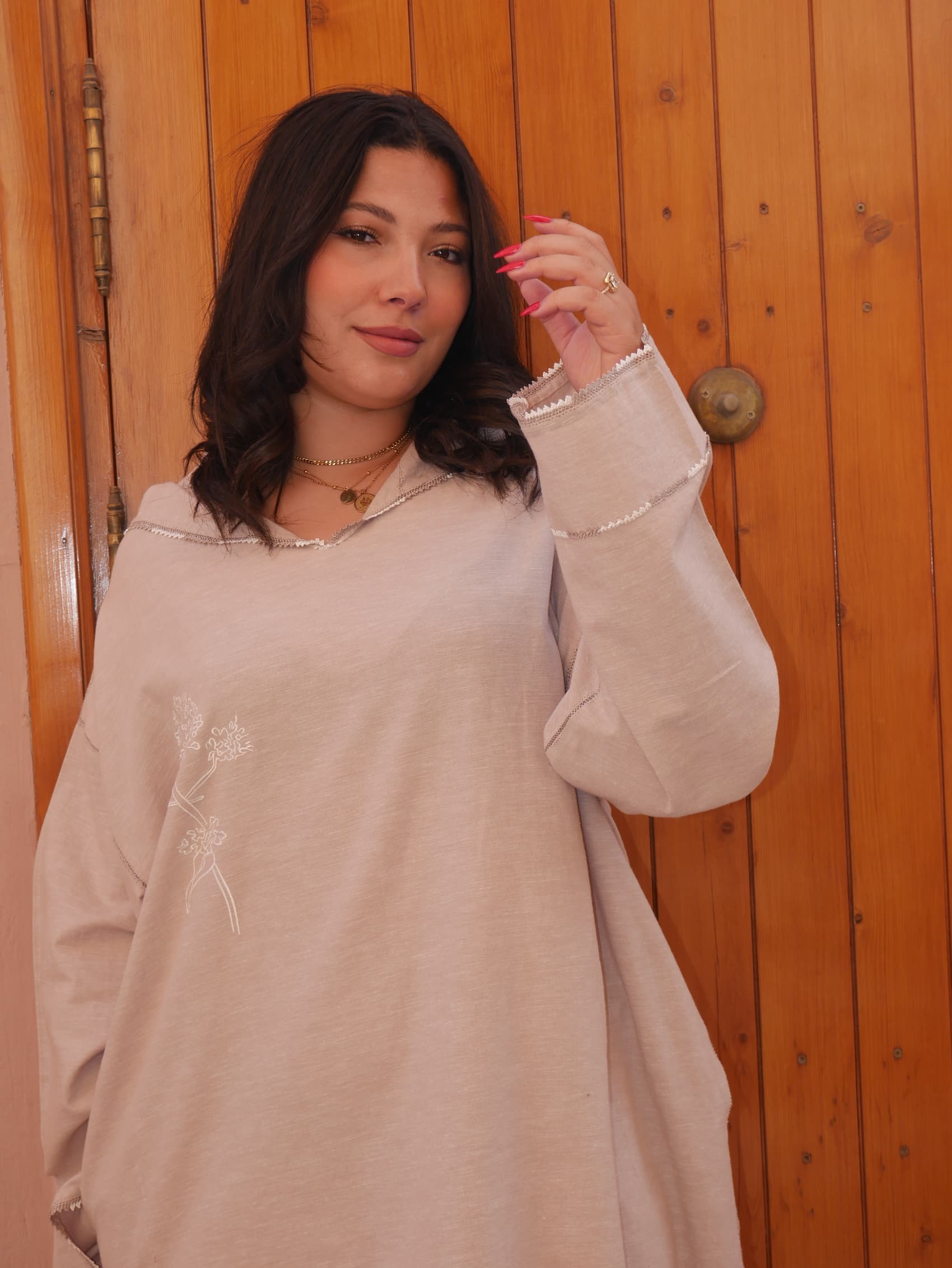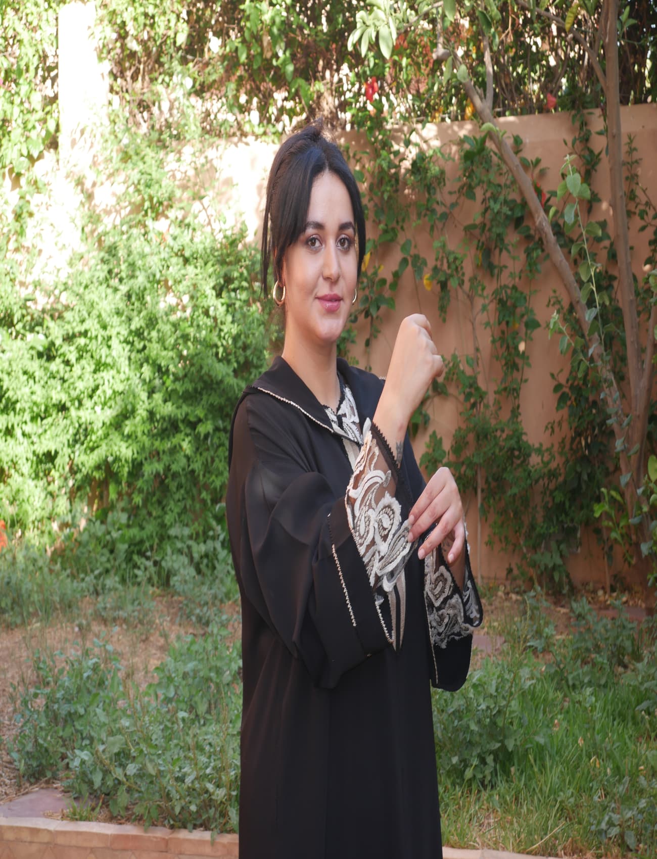 Sa coupe fluide assure une allure élégante et confortable, tandis que les détails brodés apportent une touche artisanale précieuse, signature du savoir-faire Lahjouji Création. Le contraste subtil entre le noir intense du tissu et les nuances claires des broderies crée une présence visuelle forte, à la fois discrète et affirmée.